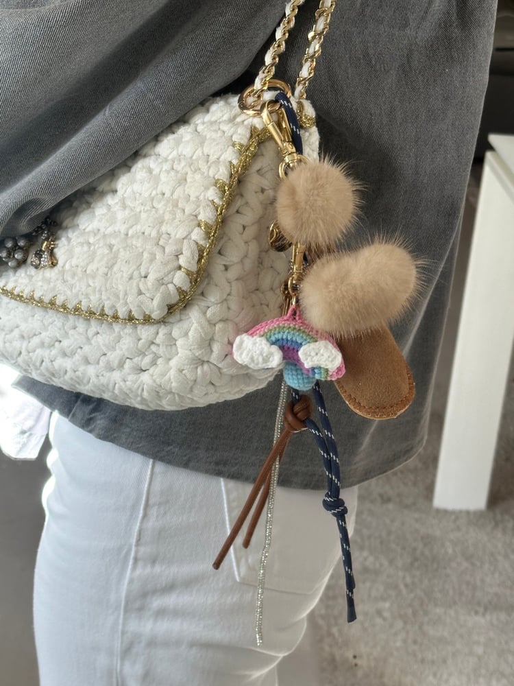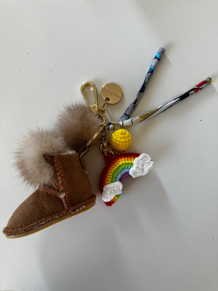 Composé d’une botte en mouton véritable , d’un arc en ciel crocheté et d’un ruban assorti , un gros mousqueton pour l’accrocher sur vos sacs à main, en bijou de sac ou en porte clé .