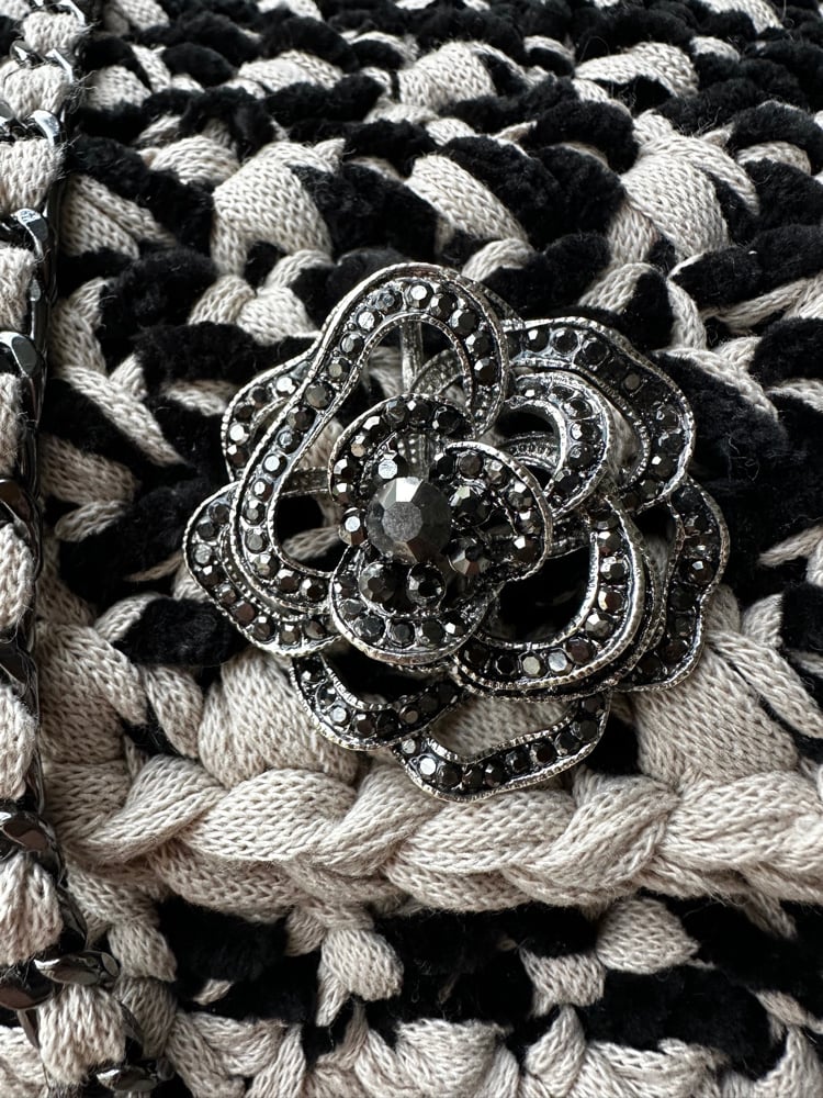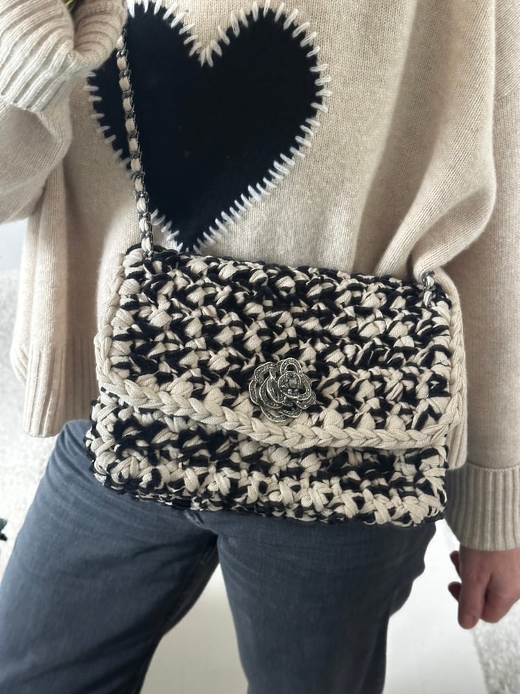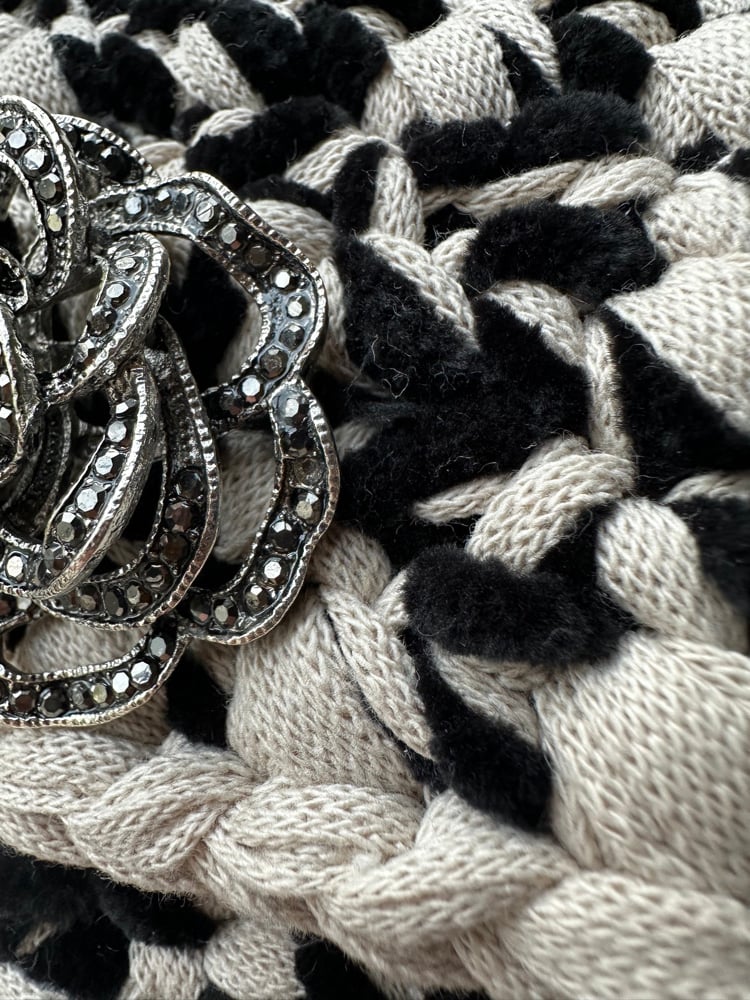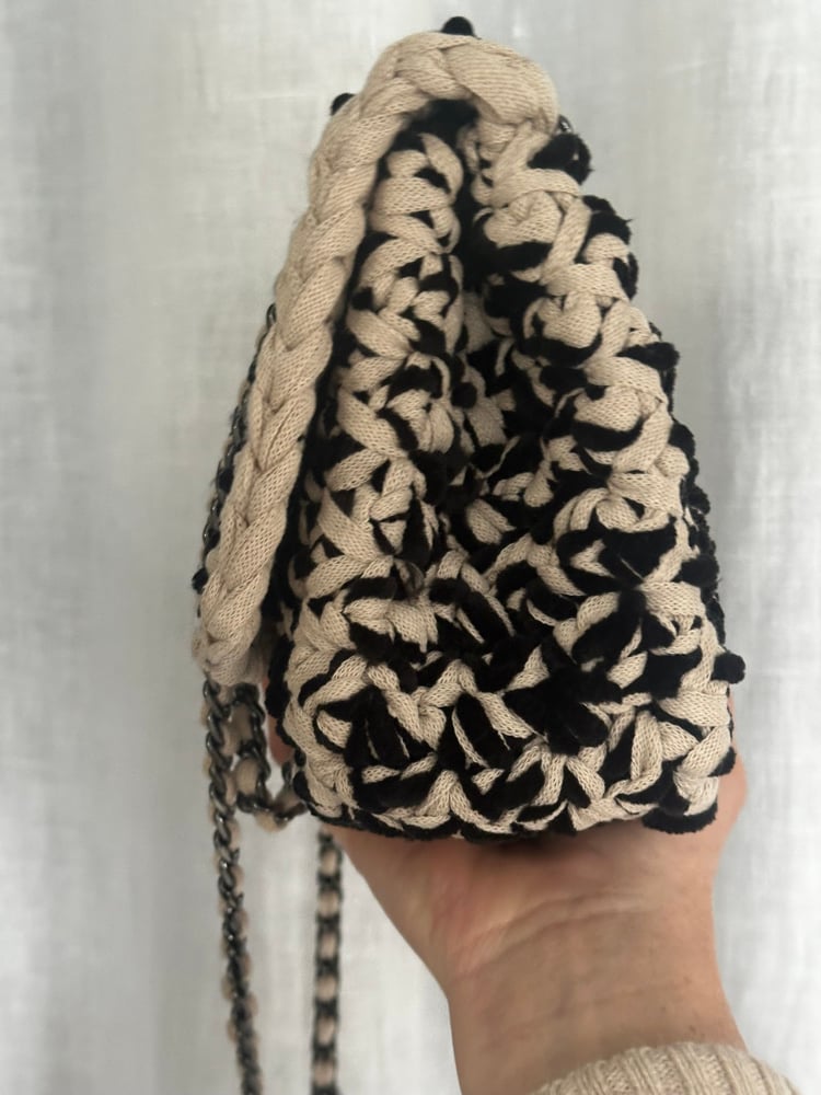 Décliné dans une association de coton beige et de velours noir pour un effet tweed très élégant.